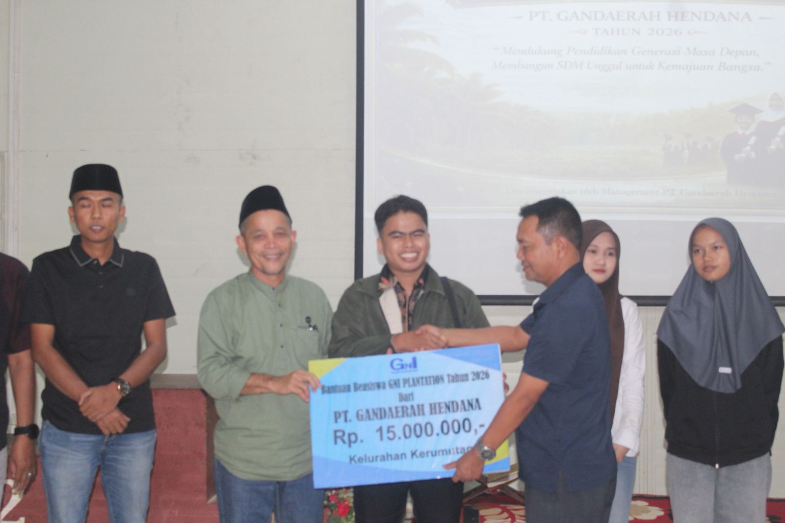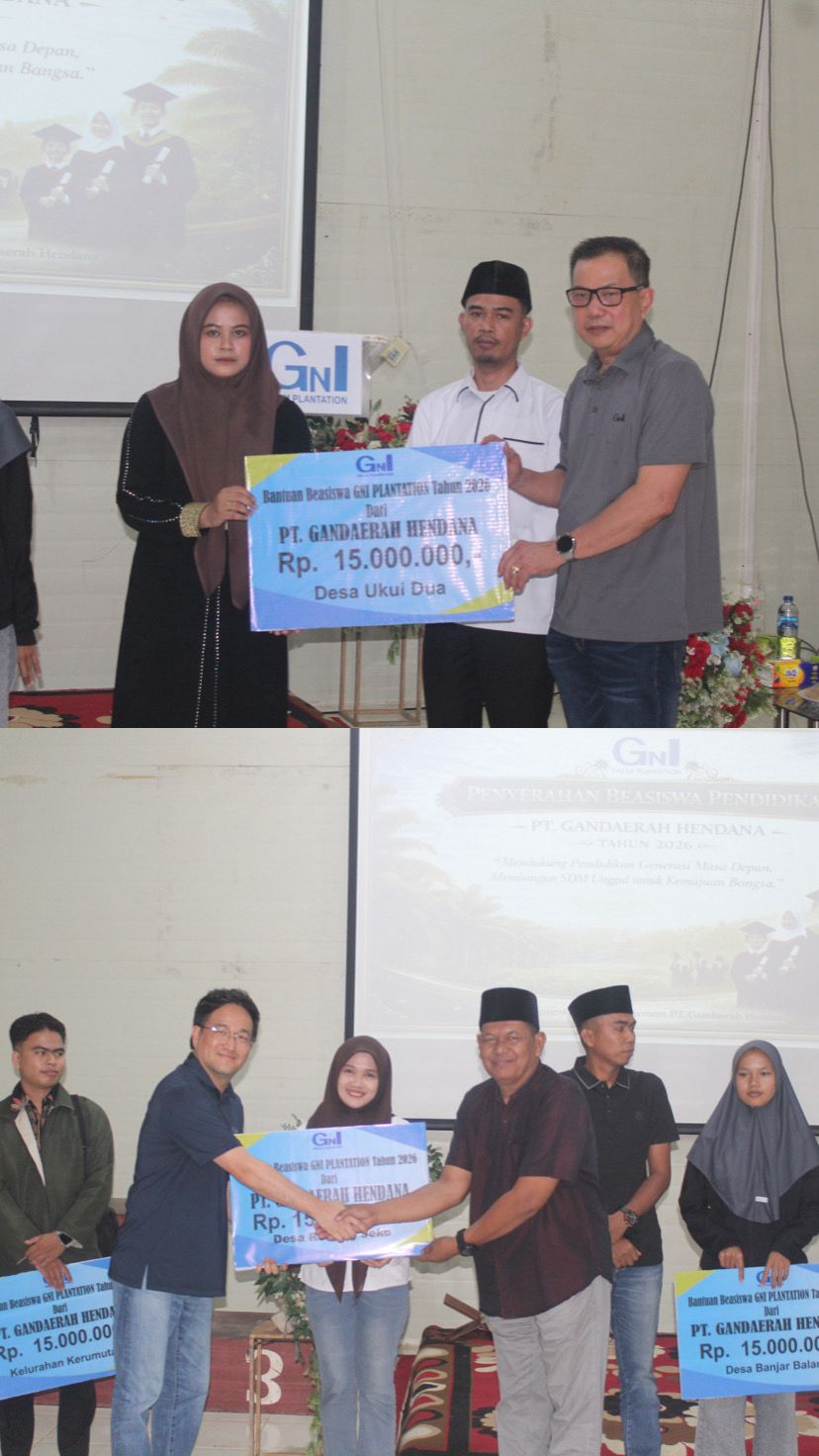 Selain itu, pada kesempatan yang sama, manajemen PT. Gandaerah Hendana juga menyerahkan Beasiswa GNI Plantation Tahun 2026 kepada 20 mahasiswa yang berasal dari desa-desa di sekitar wilayah operasional perusahaan. Penyerahan beasiswa tersebut dilakukan langsung oleh pimpinan manajemen sebagai bagian dari komitmen Tanggung Jawab Sosial Perusahaan (CSR), khususnya pada pilar pendidikan.